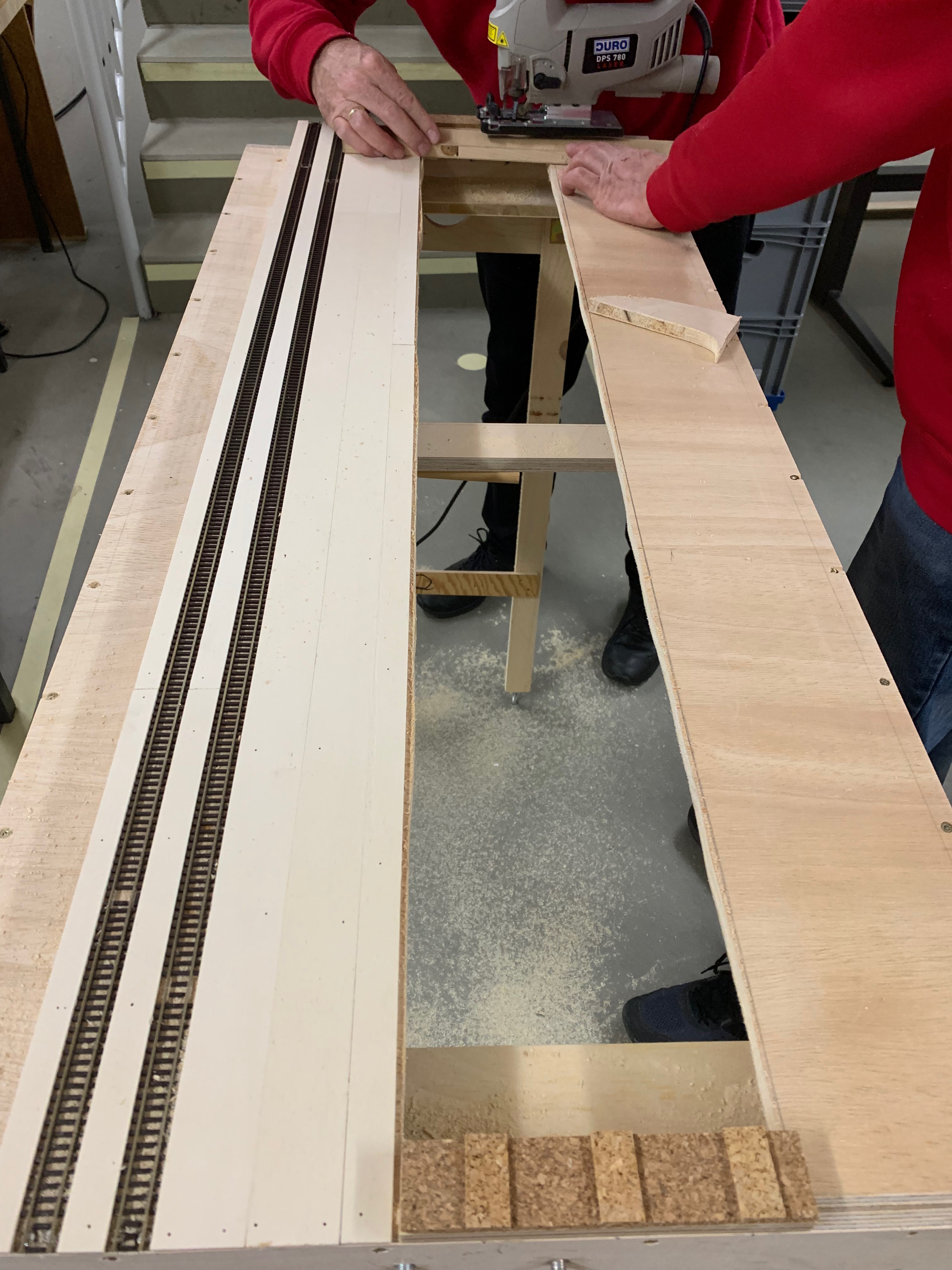 Oben im Bild ist die Rampe auf dem Nachbarmodul zu erkennen. Darunter befinden sich die Bunkerwände, die für den Stahlträger des Gleises eine Vertiefrung bekommen sollen. Die Bunkerwände wurden mit der Schraubzwinge zusammengespannt.