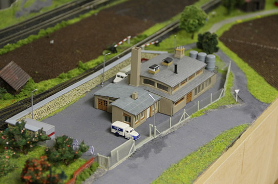 Ein Blick auf das westliche Ende des Übergabebahnhofs. Die doppelgleisige Hauptstrecke wird von der Südseite des Moduls zurück auf Modulmitte geschwenkt. Das ursprüngliche Ausziehgleis für die umzusetzdende Loks wurde nachträglich verlängert für ein Adaptermodul an das die Schubladenschiebe- bühne angeschlossen wird. Streckenplanung/-bau und Bemalung der Häuser von Gerd, Landsschafts-/Siedlungsgestaltung mit vielen tollen Ideen von Wolfgang.
