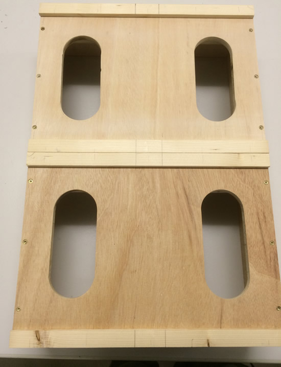 Die Schrauben der Kofferverschlüsse benötigen genügend Halt. Daher werden noch Stücke von 13mm Tischlerplatte montiert.