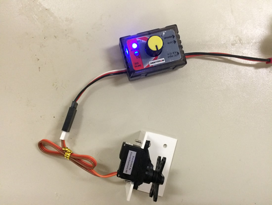 Das auf einem Abschnitt einer Winkelleiste montierte Servo wird mit dem Servotester in die Mittelstellung gebracht.