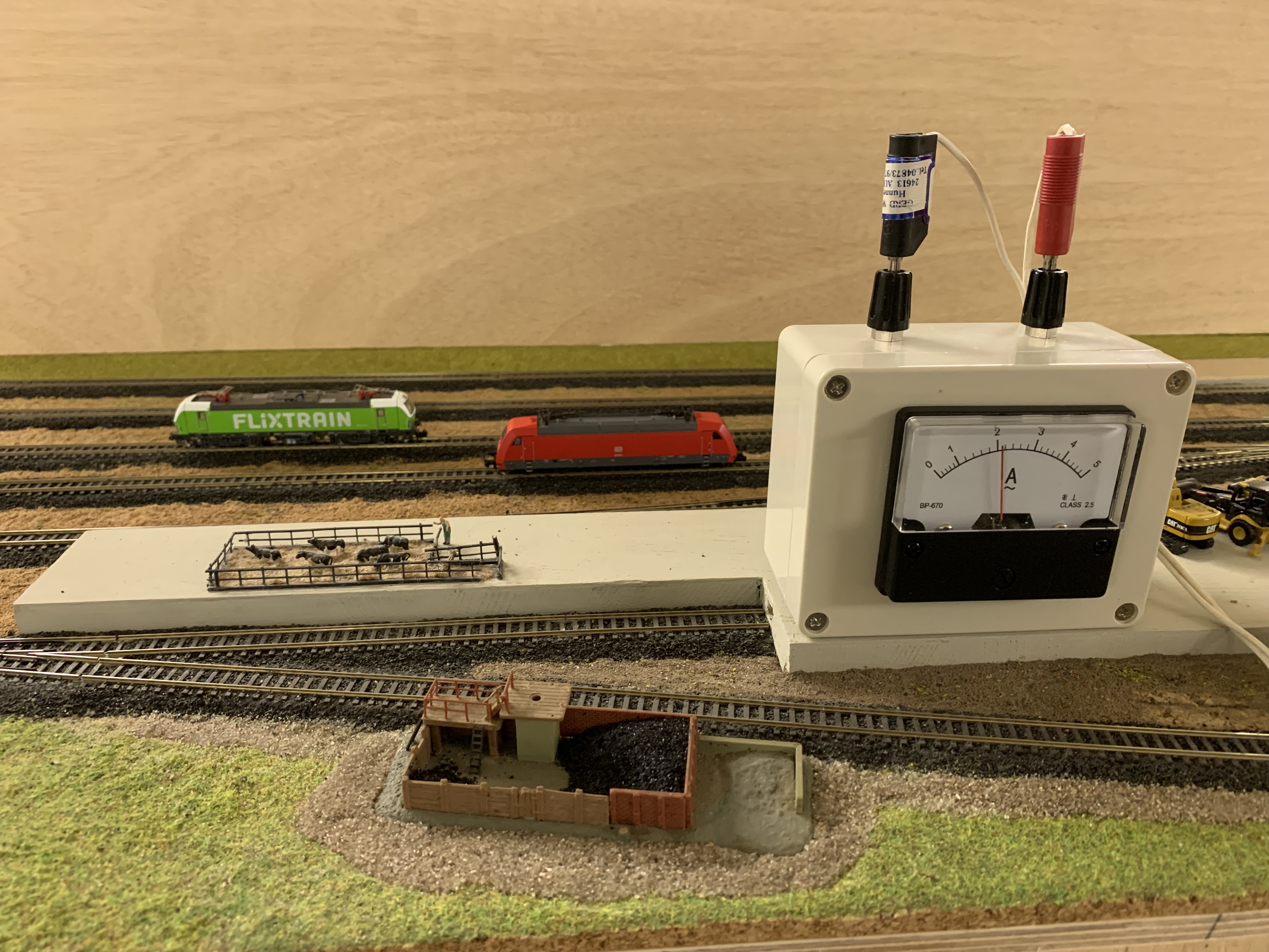 Das Meßgerät wurde am Trafo des Ortes Voldagsen angeschlossen. Unter den Segmenten des Ortes befinden sich neun Komponenten von Fichtelbahn. Vom GBMBoost werden die Bahnhofsgleise und einige Gleise der angrenzenden Module mit DCC versorgt. Hier erfolge die Messung mit zwei aufgegleisten Loks. Das Amperemeter zeigt 2,1A an. Für jede weitere Lok werden ca. 200mA dazukommen.